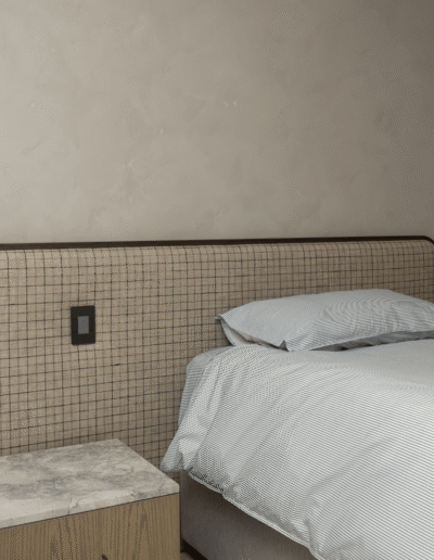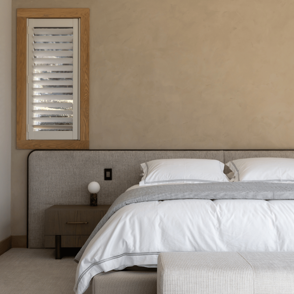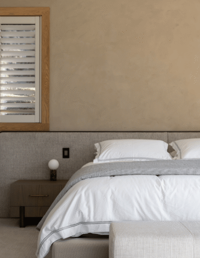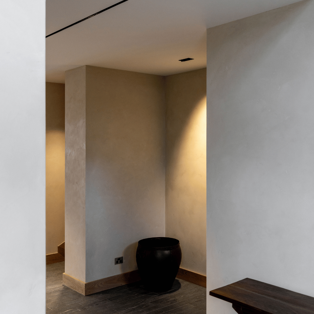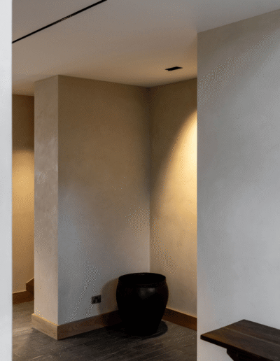 Executed by Make It Mint, the finish was carefully layered to achieve depth and variation without visual heaviness. Each application was hand-trowelled, creating a consistent yet nuanced texture that responds differently under changing light conditions. The subtle bone tone amplifies the architectural features, grounding the palette in warmth and calm.